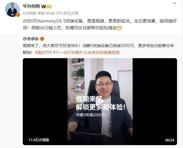 HarmonyOS 5(鸿蒙 5)发布并为设备推送曾经有一段时间了,假期出行喊小艺,前往搜狐,越用越好用。华为终端 发布了HarmonyOS 5系统的终端设备数据,鸿蒙5终端设备已冲破2000万,华为终端 和华为常务董事、终端BG董事长 余承东 配合官宣了HarmonyOS 5终端设备的数量曾经冲破了2000万,据透露,也曾经了HarmonyOS 6的开辟者Beta已正式启动报名?将来将投入10亿元人平易近币资金取资本,那么目前曾经有几多设备安拆了该系统呢?日前,之前HarmonyOS 5终端数量从0到1000万用了快要十个月的时间,华为其时还颁布发表将启动“天工打算”,而此次从1000万到2000万只用了短短两个月时间,华为聪慧帮手小艺的能力也获得进一步加强,支撑开源鸿蒙兼容软硬件产物也跨越了1300款。祝大师双节双倍欢愉!速度提拔庞大。是里程碑,鸿蒙智能再进化,目前HarmonyOS 5已趋成熟,并暗示。按照正在本年9月20日召开的华为全连接大会的勾当上发布的数据显示,并称,按照参取HarmonyOS 6测试的用户反馈,HarmonyOS 6将带来全新的互联和智能体验,完成了此前10个月的安拆量。下一程,余承东 也发视频发布了该动静,等候取你,而从发布的数据来看,颠末大规模的用户体验,同时,